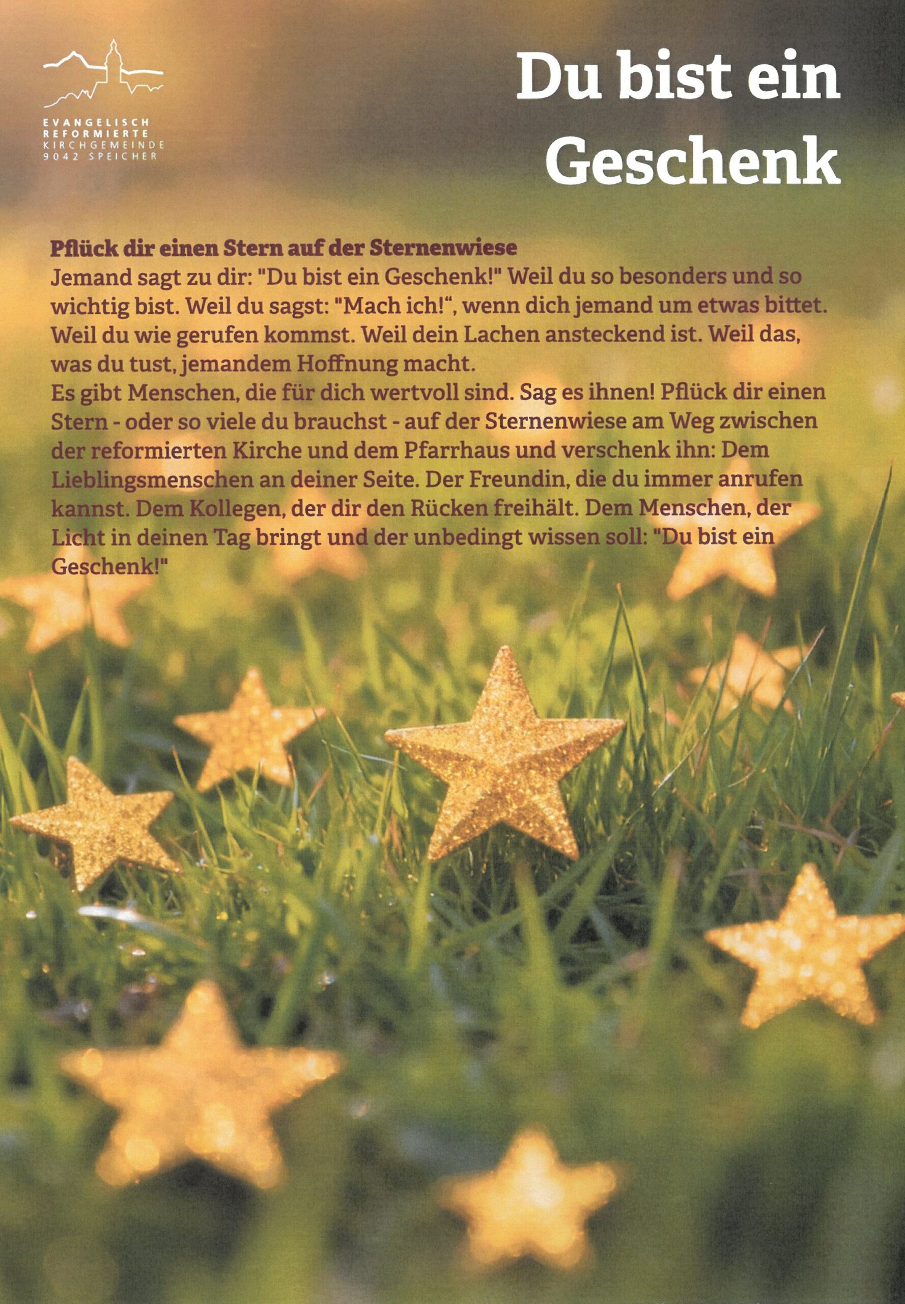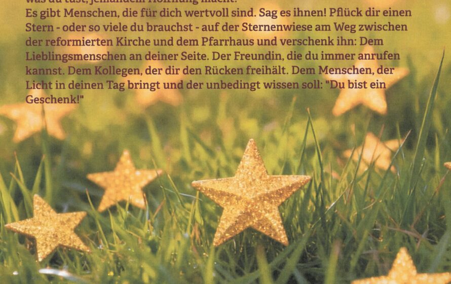 Im Advent leuchten unsere Träume heller und bestimmt kennen wir alle Freunde, Nachbarn und Mitmenschen, die uns viel bedeuten. Deshalb sagen wir “Du bist ein Geschenk!”…. Mach doch mit: Auf der Wiese am Bogenweg hinter der reformierten Kirche wachsen Sterne. Pflück Dir welche, verschenk sie weiter und sieh: Die Welt beginnt zu leuchten!