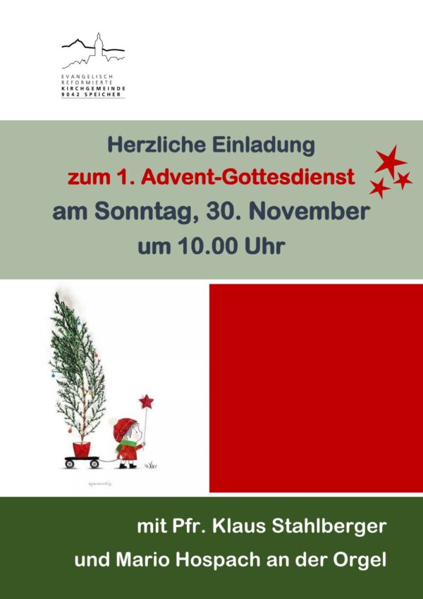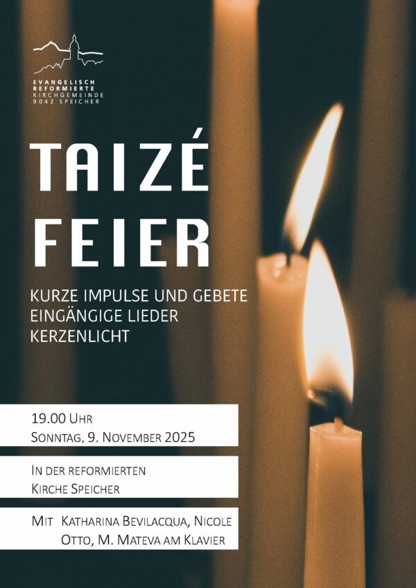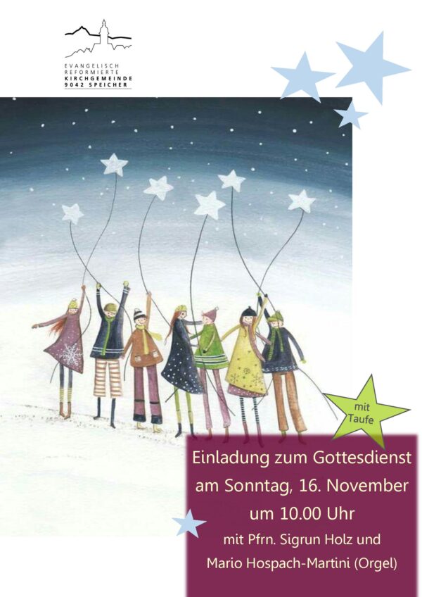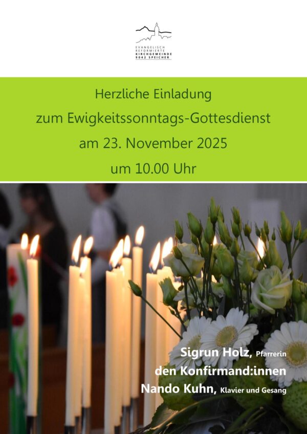 Evang. Kirche Speicher Dorf 44,Speicher,ALmit Pfrn. Sigrun Holz, den Konfirmand:innen und Nando Kuhn - Gesang und Klavier Eingeladen sind alle Menschen, die im Laufe des vergangenen Jahres einen vertrauten Menschen durch den Tod verloren haben. Der Gottesdienst bietet aber auch Raum, um über Trauer und Verlust nachzudenken und sich für den Weg in die Zukunft zu stärken.
