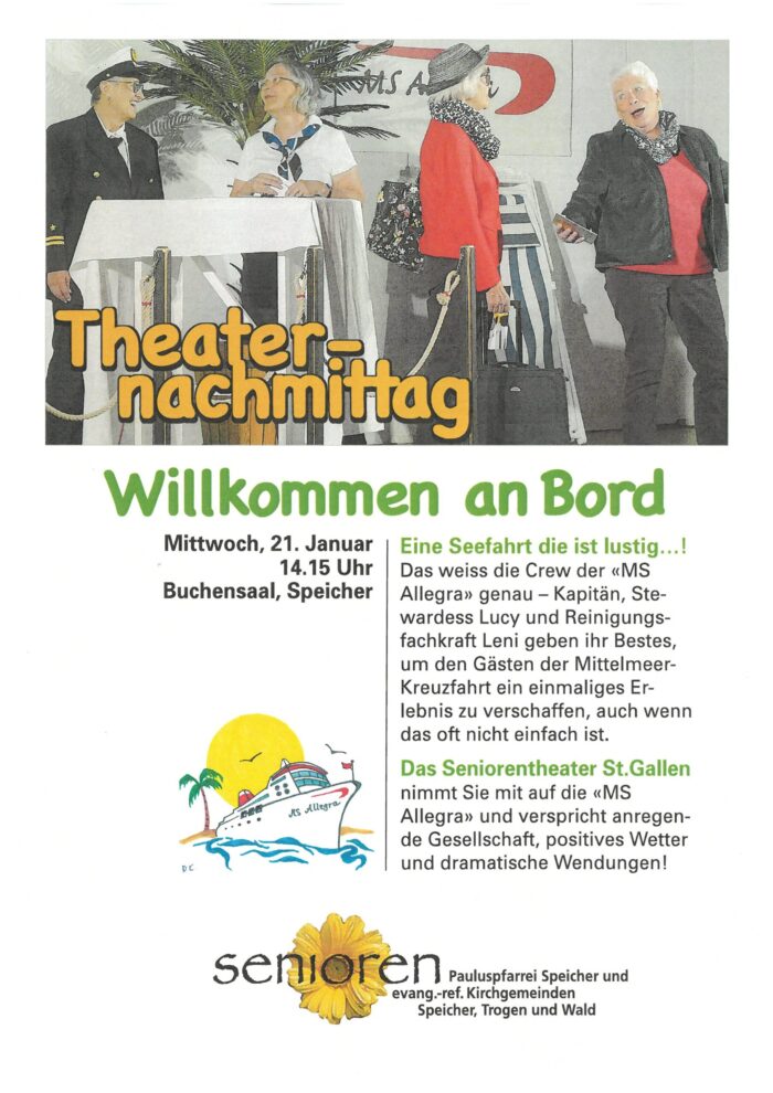 Buchensaal Speicher Buchenstrasse 32,Speicher,SwitzerlandDas Seniorentheater St. Gallen nimmt Sie mit auf die "MS Allegra" udn verspricht anregende Gesellschaft, positives Wetter und dramatische Wendungen......
