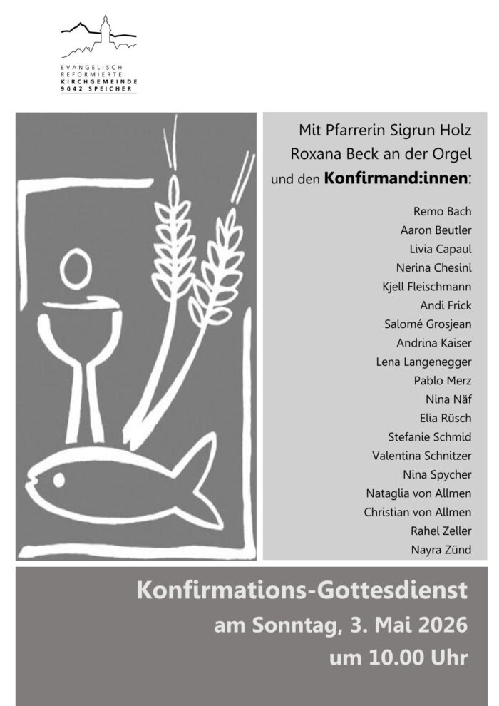 Evang. Kirche Speicher Dorf 44,Speicher,ALmit Pfrn. Sigrun Holz und Roxana Beck an der Orgel. Dies sind unsere Konfirmand:innen: Remo Bach Aaron Beutler Livia Capaul Nerina Chesini Kjell Fleischmann Andi Frick Salomé Grosjean Andrina Kaiser […]
