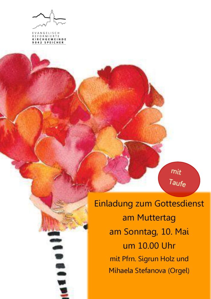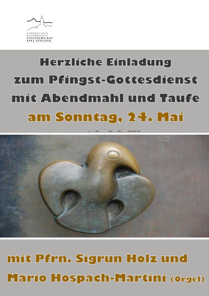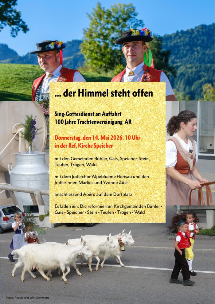 Evang. Kirche Speicher Dorf 44,Speicher,ALReg. Singgottesdienst an Auffahrt der ref. Appenzeller-Mittelländer-Kirchgemeinden zum 100-jährigen Jubiläum der Trachtenvereinigung AR mit Pfrn. Sigrun Holz, Pfrn. Irina Bossart, Pfr. Dietmar Metzger, dem Jodelchor Alpeblueme Herisau, den Jodlerinnen Marlies […]