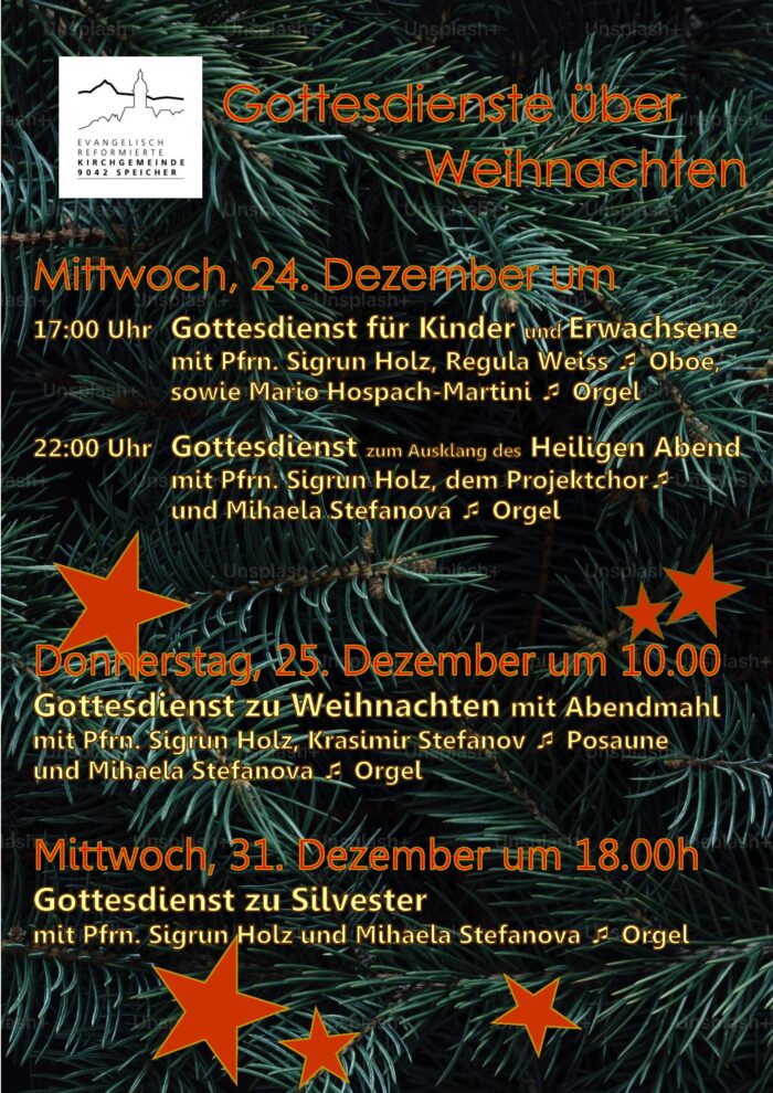 Evang. Kirche Speicher Dorf 44,Speicher,ALProjektchor der reformierten Kirchgemeinde Speicher Gemeinsam singen – den Heiligabend festlich gestalten! Proben: Sonntag, 2. und Samstag, 8. November Sonntag, 14. und Samstag, 20. Dezember jeweils 11.20 Uhr in der reformierten Kirche Speicher. Der festliche Höhepunkt: Gottesdienst am Heiligabend, 24. Dezember, um 22 Uhr in der ref. Kirche. Leitung: Mihaela Stefanova, Organistin und Musikerin. Auskunft: […]