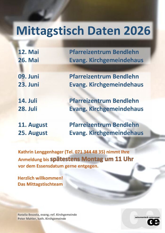 Pfarreizentrum Bendlehn Bruggmoos 29,9042 SpeicherDie Termine für 2026 können über diesen Link heruntergeladen werden: Mittagstisch 2026
